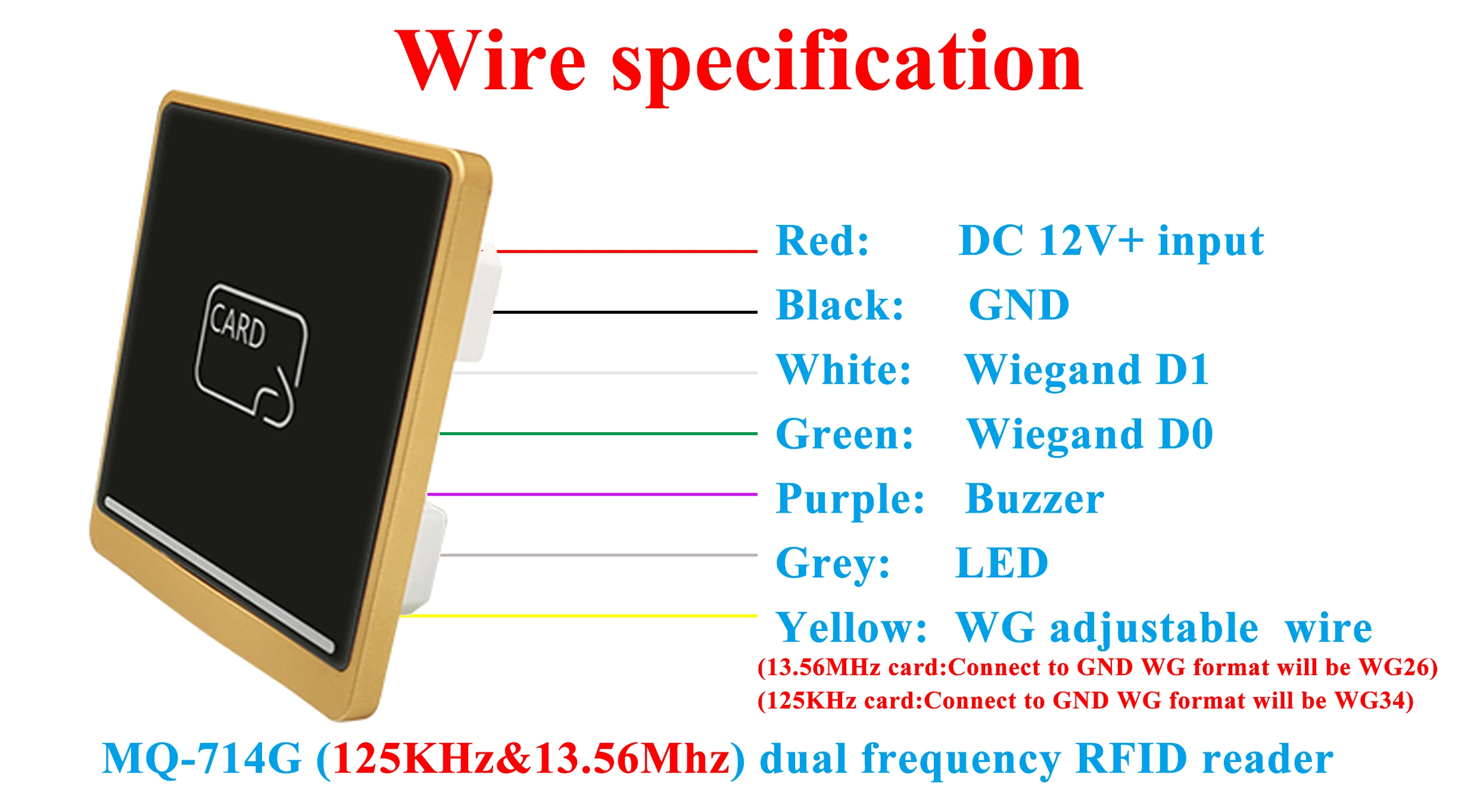 12V+(Red wire)/GND(Black wire)/D0(Green)/D1(White) Buzzer(Purple)/Beeper(Grey)WG 26(Yellow) |