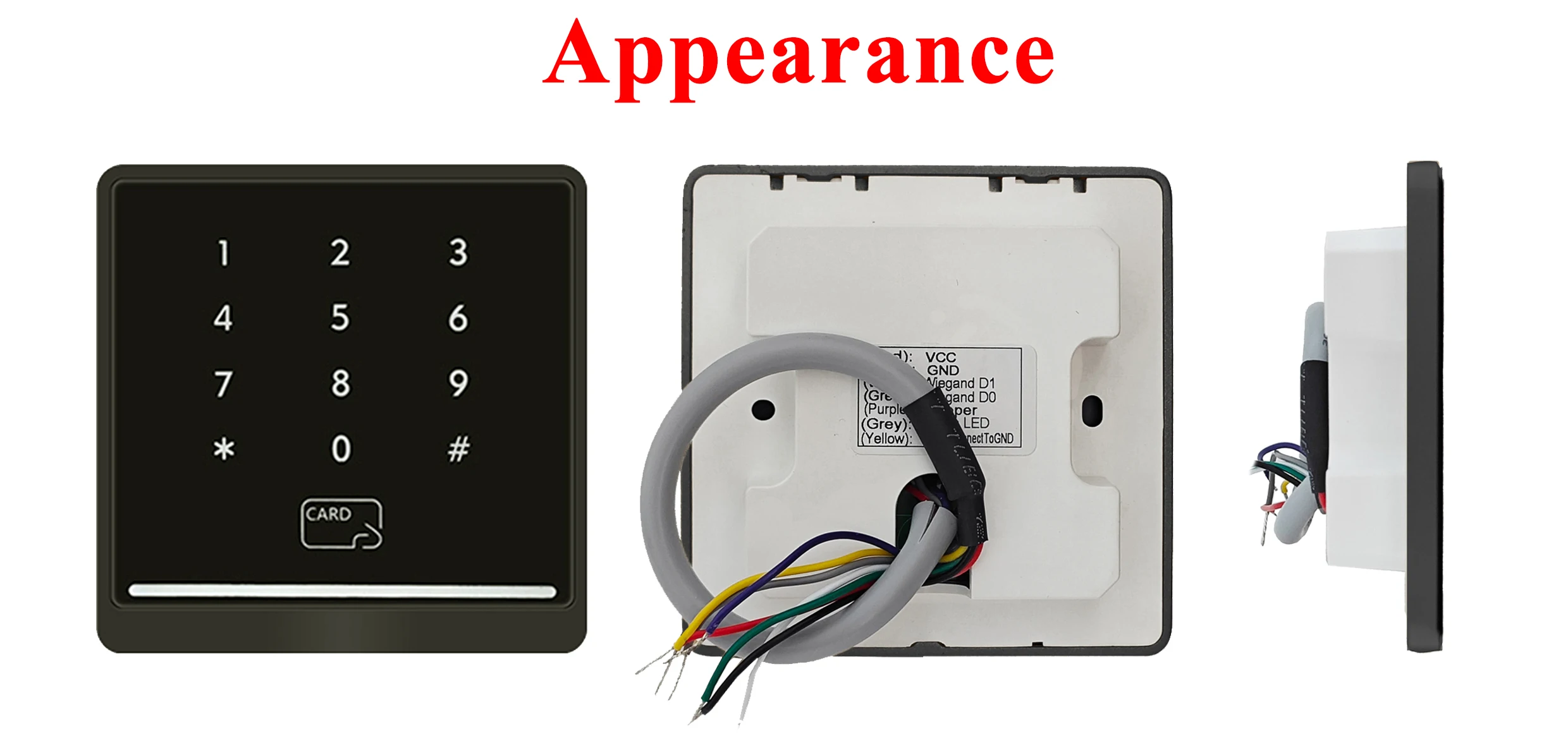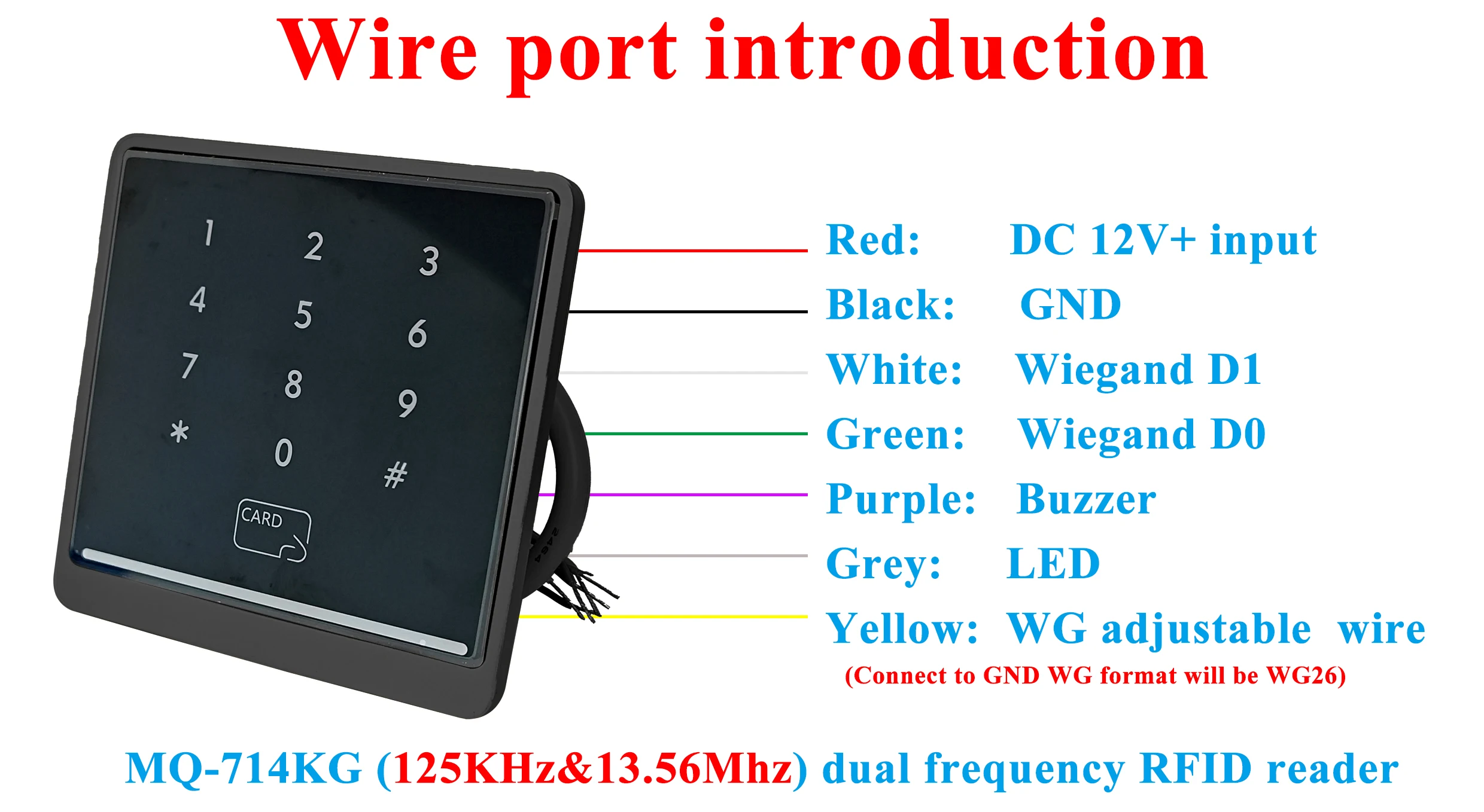 12V(Dây đỏ)/GND(Dây đen)/D0(Xanh lục)/D1(Trắng) Còi(Tím)/Beeper(Xám)WG 26(Vàng) |