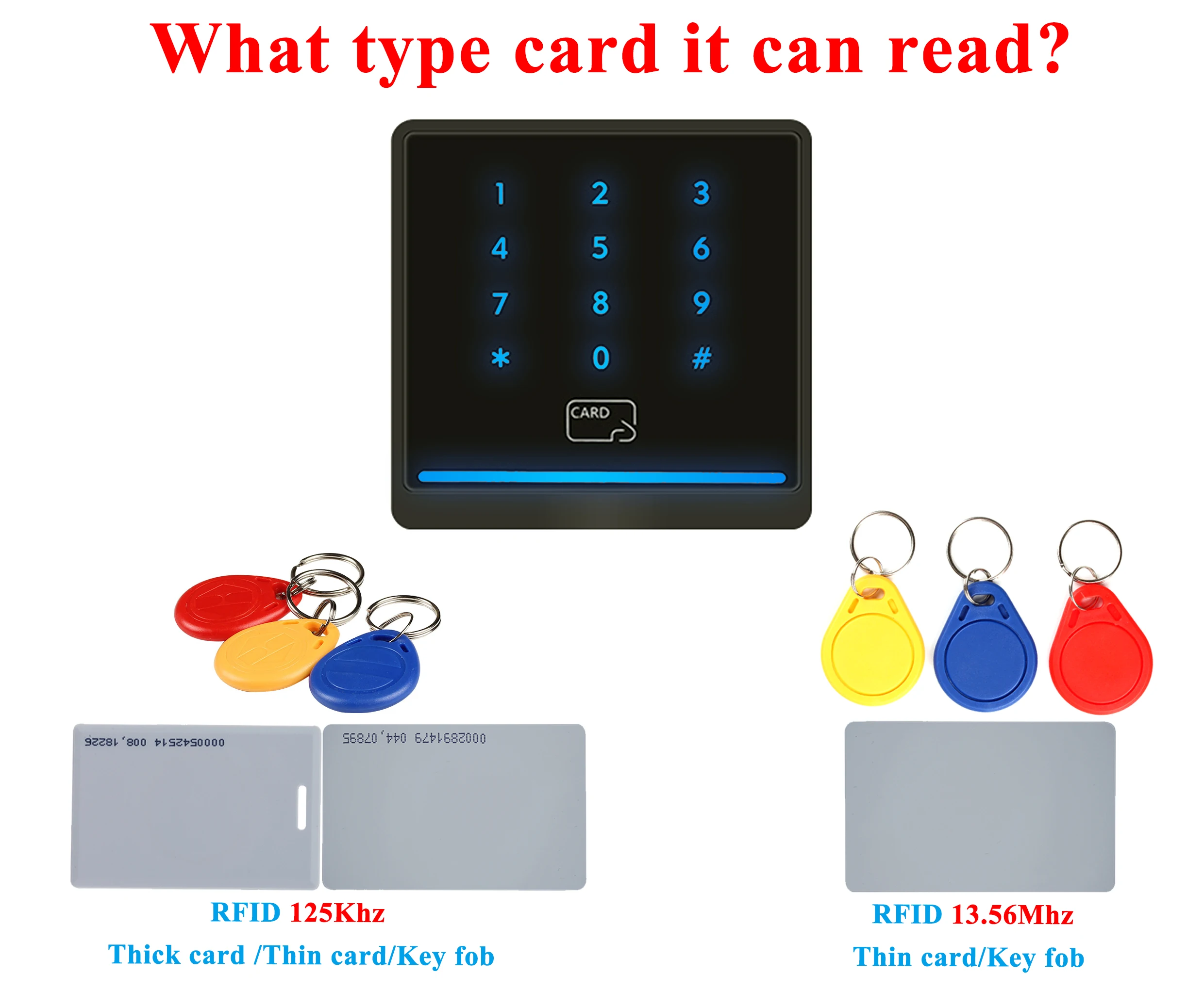 - Loại thẻ: Thẻ ID (125Khz) & Thẻ IC (13,56 MHz)